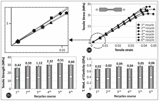 Recycle courses’ comparative graph: (a) tensile stress vs. strain; (b) tensile strength; (c) and tensile modulus of elasticity.