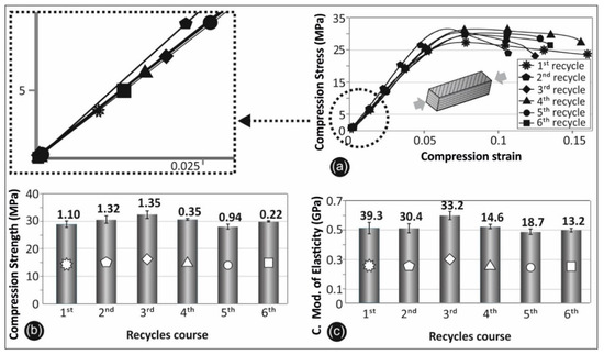 Recycles courses’ comparative graph: (a) on compressive stress vs. strain; (b) compressive strength; and (c) compressive modulus of elasticity.