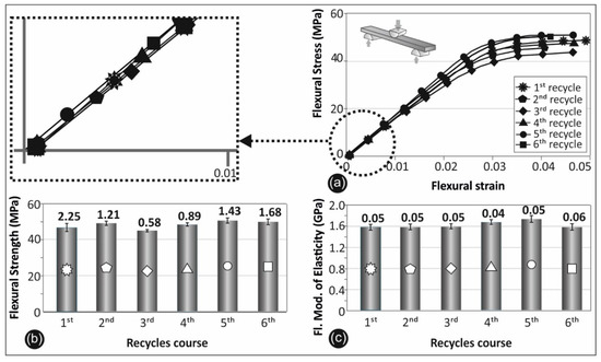 Recycles courses’ comparative graph: (a) flexural stress vs. strain; (b) flexural strength; and (c) flexural modulus of elasticity.
