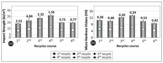 Results for all the recycle courses studied: (a) impact strength; and (b) micro-hardness Vickers.