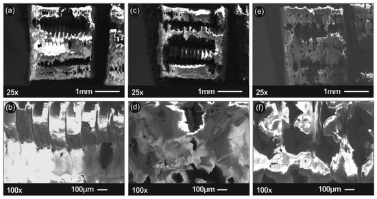 SEM images of the tensile fracture area of the representative specimens for 1st (a,b), 2nd (c,d) and 3rd (e,f) recycle course.