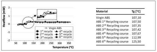 Differential scanning calorimetry (DSC) was performed in the virgin ABS polymer and after each recycling course in order to obtain information about the effect of recycling on the glass transition temperature (Tg) of the polymer. The measurements were taken via a Perkin Elmer Diamond DSC with a temperature cycle of 50 to 350 °C, with a heating step of 10 °C/min, and then cooled back down to 50 °C.