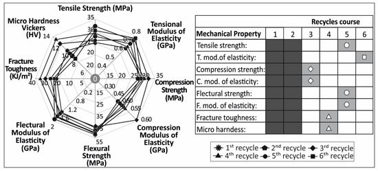 Regarding the tensile modulus of elasticity (Figure 4c), it was shown that the values of all courses were similar. The peak value for the tensile modulus was found in the fifth recycle chain, with an increase of 15% when compared with the first recycle course. The values of the flexural modulus of elasticity (Figure 6c) follow a similar pattern as the peak value appears also on the fifth recycle course, with an increase of 15.8% when compared with the first course. Finally, regarding the compression modulus of elasticity (Figure 5c), the highest value was present on the third recycling course, with an increase of 16.7% compared with, as always, the initial course.