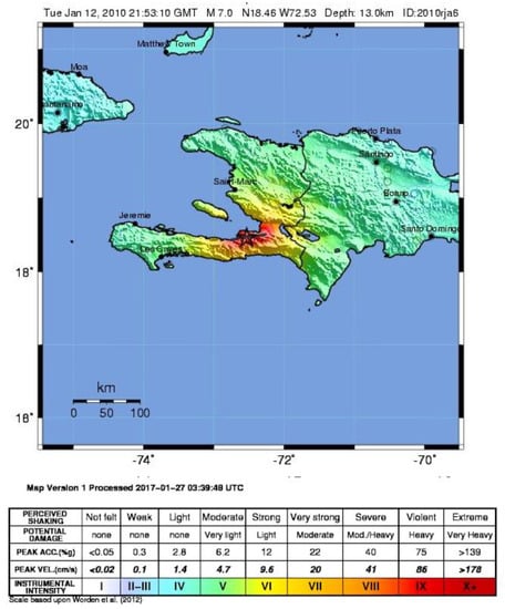 - USGS. English: Shake Map of 2010 Haiti Earthquake. 2010. Available online: https://earthquake.usgs.gov/earthquakes/eventpage/usp000h60h/shakemap/intensity (accessed on 25 February 2020).