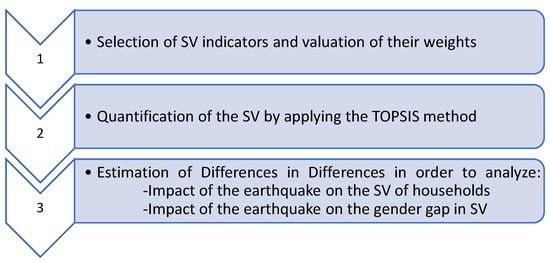 Work development is done in three stages (Figure 2). First, all available SV indicators in the sample are selected. Second, the SV is quantified in the event of a disaster using the TOPSIS method. Finally, thirdly, by means of a Differences in Differences (DID) estimate, the impact of the 2010 Haiti earthquake on the SV of households is analyzed by assessing whether in women-led households it is increased as a result of the disaster with respect to that of men increased the gender gap in households.