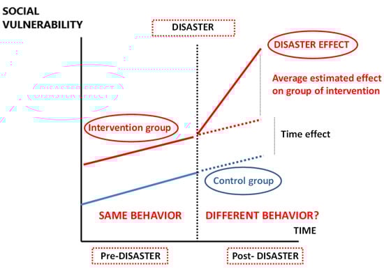To measure the impact of the earthquake on gender relations, the quasi-experimental differences in differences (DID) technique is used, which uses longitudinal data from two population groups, treatment and control, to obtain an appropriate counterfactual that allows the estimation of a causal effect (Figure 3). In our study, the temporal variable (t) includes the pre-disaster points (wave of the 2005-6 survey, t = 0), and the post-disaster (wave of the 2012 survey, t = 1) thus allowing the comparison of households affected by the earthquake and those not affected in the aforementioned temporary references. In our case, the DID estimator would represent the difference between what happened before and after the 2010 earthquake in Haiti between the group affected by the disaster and the control group [75,76].