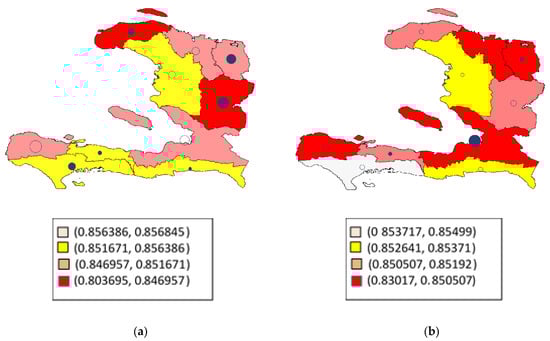 Social vulnerability map. Haiti. Social Vulnerability Haiti 2005–2006 (a) Social Vulnerability Haiti 2012 (b). Source: Our elaboration, based on the DHS. Fix legend number alignment