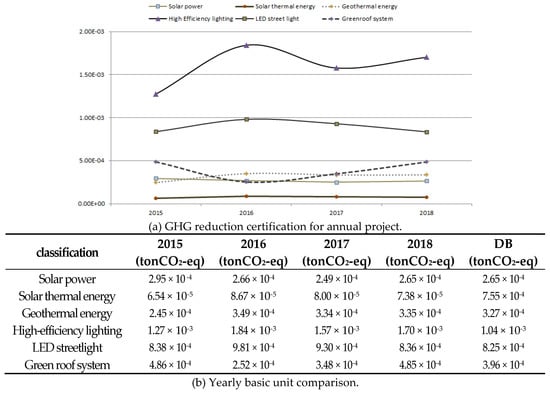 The yearly basic unit and evaluation DB of external reduction projects implemented from 2016 to 2018 were used as basic data and were compared to verify the reliability of the constructed evaluation DB. As a result of the yearly comparison, the basic unit change of external reduction project from 2015 to 2018 was insignificant. However, in the case of high-efficiency lighting replacement, the average annual increase/decrease rate was approximately 18%. This is because the number of projects was smaller than that of other projects, and the number of data points was also small. The differences between annual unit data and evaluation DB, solar power, solar thermal energy, geothermal energy, wind power, high-efficiency lighting, LED street light installation, and rooftop greening were calculated to be 4.31%, 9.07%, 9.05%, 52.7%, 16.92%, and 23.38%, respectively. In the high-efficiency lighting replacement project with a high increase/decrease rate by year, we confirmed that the difference between evaluation DB numbers was also high.