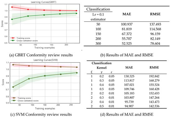 To optimize the SVM model, it is necessary to determine C, a hyperparameter that controls penalty for an error in the kernel function, , which is related to the impact and extent of training data, and , which is related to the allowable error rate. Figure 2 shows the conformity results for SVM. The radial basis function (RBF) kernel was applied as the kernel function. While changing C, , and , we determined a model that minimized the MAE and RMSE of data validated by k-fold cross-validation as the final SVM model. In the parameter where and , the predictive power was mostly outstanding. The models where and and where C was 2 were selected as the final models, and data were applied from cross-validation.