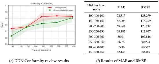 To optimize DNN, it is necessary to determine the input, number of hidden layers, activation function, optimizer for weights, test epoch, batch, and dropout to prevent overfitting. Our study used 30 inputs, 1 output, 3 hidden layers, 200 tests, a batch size of 50, ReLU as the activation function, the Adam algorithm as the optimizer, and a dropout of 20%. While changing the number of nodes in the hidden layers, we determined the model that minimized the MAE and RMSE of data validated by k-fold cross-validation as the final model. The results of our DNN analysis showed that an increasing number of nodes in the hidden layers tended to decrease the MAE and RMSE; however, these were shown to increase if the number of nodes exceeded 300. Hence, the models with a number of nodes equal to 400-400-400 and 450-450-450 were selected as the final models.