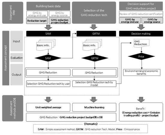 Based on the aforementioned requisite elements, an integrated assessment system concept consisting of a simple assessment method (SAM) and GHG reduction technology assessment model (GRTM) was established. The SAM was defined as an evaluation method for GHG reduction.