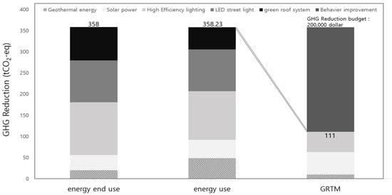 Case 1 reflects the subjective opinion of the evaluator, and the applicability of the evaluation result is inferior. In addition, the environment of the building is not substantially considered, and this is a disadvantage. Case 2 shows the optimal GHG reduction projects identified by GRTM. Unlike Case 1, the budget assumed that GHG reduction technologies would be installed in the building. This case is considered to be the optimal GHG reduction technology project based on data analysis when considering the total floor area of buildings, energy use, and consumption by the relevant energy source. Certified GHG emission reductions (KOC), which consider the characteristics of a building and can be obtained within the total budget of 200,000 USD, were confirmed to be 111-ton CO2-eq. The results of the GRTM suggest a distribution of 48-ton CO2-eq in high-efficiency lighting, 53-ton CO2-eq in solar power, and 10-ton CO2-eq in geothermal energy. From these results, the building in this case study has the potential for GHG emission reductions in heating, cooling, and lighting. These are derived from the area, consumption by energy use and source, and budget information of the building.