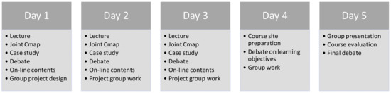 - Course design: The course model template was taken from the Erasmus+ KA2 project Essence, [19] which was selected for academic staff training due to its successful implementation in Vietnam. The design included five days’ full-time work (one per week) for avoiding conflicts with the baseline activities from all participants. Nobody traveled (except for the final presentations and evaluation), and used TEL as the unique support vehicle both in teaching and learning. Regarding capacity-building, key points for the lectures on each course were identified from the needs analysis. Interaction and applicability were guaranteed thanks to the debate methodology. The structure is presented in Figure 2.