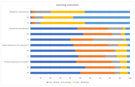 Through the following graphs, a quantitative analysis of the previously identified requirements for the implementation and participant assessment are shown. The first (multiple) dimension experimental results are presented on Figure 3, Figure 4, Figure 5 and Figure 6, and the learning outcomes dimension results are presented in Figure 7. Graphs include bars with the percentual evaluation for each of the questions.