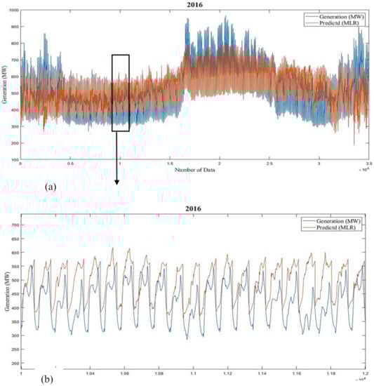 (a) Estimated vs. actual values for generation (2016, long-term). (b) The zoomed part of the graph.