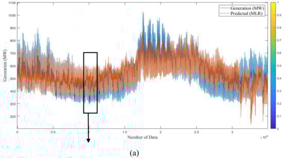 In this formula, β0–βp are the regression coefficients to be estimated according to observations. To avoid multicollinearity problems, correlations between predictors should be controlled (the correlation coefficient of the explanatory variables should not exceed 0.7) [53]. The last term in the formula, ε, denotes the random error and is referred to as the residual to check the overall significance of the model and each regression coefficient [54]. The error term is independently and normally distributed, with a mean of zero and a constant variance of σ2 [55]. Regression models describe the relationships between output values and one or more input values. A multiple regression model is a parametric model. There are many statistical and machine learning methods to generate results, such as linear, generalized, and nonlinear regression models, containing mixed effects and stepwise models. The relationship between the numeric predictor and the continuous target is approximated by simple linear regression by using a straight line. The relationship between a set of p > 1 predictors and a single continuous target approximates multiple regression modeling using a P-dimensional plane [56]. One of the main objectives of regression modeling is to select the best suitable regression that can develop an accurate response variable. Regression trees (RTs) and ANNs are ambitious techniques for modeling regression problems. Multiple linear regression (MLR) is a classic technique that delivers many benefits: clarity, interpretability, the potential to be modified over parametric transformations, and reasoning, assuming the normality hypothesis, homoscedasticity, and inter-correlation between the error ε and the predictor variables. Figure 17 and Figure 18 show outcomes of MLR numerical investigation of estimated versus actual responses of long-term examination, with scaled coefficients, where the solid line symbolizes the fitting line. Figure 19 and Figure 20 demonstrate the results of the MLR numerical study of predicted versus actual responses of short-term examination. The graphs show that estimated and actual data are not well matched. The average prediction errors of long-term and short-term MLR models for 2016 and 2017 are 15.18% and 13.4%, and 10.44% and 9.08%, respectively.