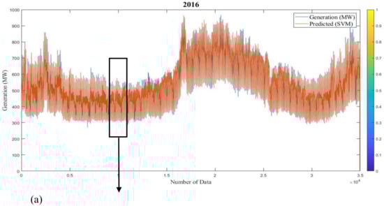 The SVM model is trained by utilizing the sequential optimization algorithm function and the kernel function utilized is the radial basis function. The MLR model was achieved from the repeated random subsampling procedure with 20 runs. Then, the MLR model with many iterations (1000) reached the ultimate forecast outcomes, and was used for the persistence of outcome assessment. Figure 25 and Figure 26 and Table 3; Table 4 show the predicted generation responses from ANN, ANFIS, MLR, and SVM models and the real responses in variable investigational situations for 2016 and 2017 (long-term). Figure 27 and Figure 28 and Table 5 and Table 6 show the forecast generation results from the mentioned models and the actual outcomes in adaptable investigational conditions for 2016 and 2017 (short-term). Outcomes show that the actual responses are in near agreement with the predicted responses. The average prediction errors of ANN, ANFIS, MLR, and SVM models for long-term analysis are 5.57%, 7.69%, 15.18%, and 4.34% for 2016 and 5.28%, 6.11%, 13.4%, and 4.49% for 2017, which proves that the SVM and ANN models are relatively superior to other ML techniques. Additionally, Root Mean Square Error of the models proves the same result. Likewise, the defined errors of ANN, ANFIS, MLR, and SVM models for short-term study are 0.97%, 3.75%, 10.44%, and 2.24% for 2016 and 1.67%, 3.89%, 9.08%, and 2.12% for 2017, which shows that the ANN and SVM models are preferable over the other methods. Correspondingly, RMSE of the models proves that ANN is more superior to the other methods. The summery performance of all models are presented in Table 7.
