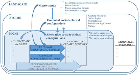 Figure 1 shows the operationalisation of the ideas mentioned: in niches, alternative socio-technical configurations emerge. These configurations create the means for the expansion of capabilities of people operating in the niches, which are different from the capabilities of people operating in dominant regimes. Regimes and landscapes model and structure the process of expansion of capabilities, operating as external conversion factors together with personal conversion factors. More in general, they model public reasoning processes and the development of the niche.