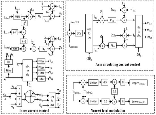 Figure 9 presents the inner current control loop based on Equations (18) and (19). In addition to these equations, current and modulating voltage limiters are employed to prevent overcurrent through the transistor. Isd current is allowed to reach maximum permissible current due to DC link voltage control has more priority than reactive power control. However, both currents have equal weights in the real-reactive control mode of MMC if the total current exceeds the maximum permissible current (Imax). As can be seen from Figure 9, the voltage magnitude remains inside the unit circle without changing the angle of Vd and Vq. Apart from the inner current control loop, circulating current control and submodule voltage balancing control are employed in low level control. The circulating current results from the voltage difference between the upper and lower arms, does not have an impact on the AC output voltages and currents but increases the rating of the devices, power losses, and ripple in submodule capacitor voltages. The circulating current comprises twice fundamental frequency negative sequence components [32,33]. The circulating current control dynamics in the d-q reference frame rotating at frequency is given by the following equation.