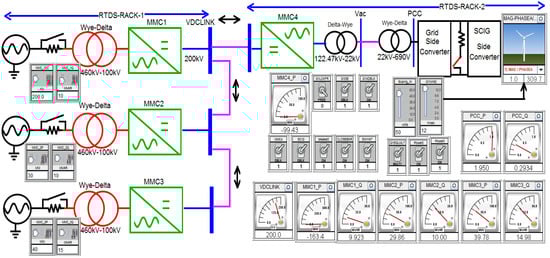 RTDS is a high computing device and works as real time simulator which facilitates the interaction with the physical hardware. It uses only fixed step discrete solver, whereas non-real time variable step solver and continuous model could be used in MATLAB Simulink. The sample time for power electronics switch is 2.3 µs and for controller is 50 µs. We have used a multirack RTDS platform to simulate such a large system considering detailed MMC model in real time. PB5 and Nova core form the multirack RTDS hardware platform. MMC1, MMC2, and MMC3 are placed in one rack, and MMC4 with wind farm are placed in another rack.