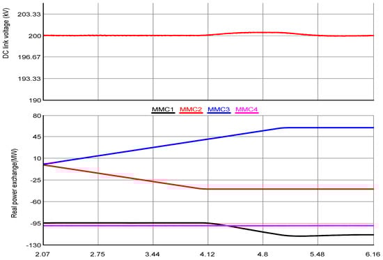 Figure 12 shows the HVDC link voltage and AC voltage controller performance. MMC1 is kept blocked until 1.5 s and then unblocked to control the HVDC link voltage gradually towards 200 kV. During the blocking period, the current limiting resistor is active and then bypassed at 1.5 s. DC voltage reaches its reference around 3 s. After HVDC link voltage settles, MMC4 starts controlling the AC voltage to provide the support for renewable energy integration.