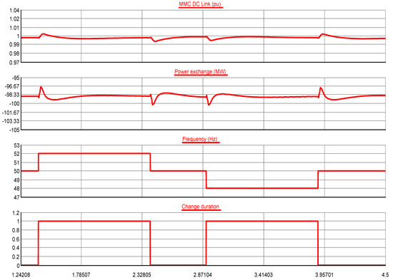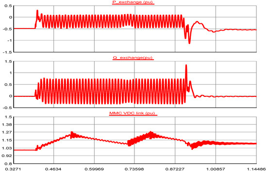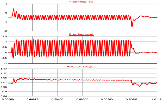 Outer loop control is called high-level control. It can operate as high voltage DC link and reactive power/AC grids voltage control, real and reactive power control, and isolated AC voltage control, as presented in Figure 8. In this work, MMC DC link voltage control and AC voltage control are given more priority than fixed reactive power control during fault at the point of common coupling of the AC grids. During line to ground fault where possible maximum real power transfer is limited results more reactive power support irrespective of its reactive power command. HVDC link voltage controller includes a PI controller that processes the error and feed forward controller (information of HVDC link current) for improved dynamic performance. The PI controller provides the necessary adjustment for the reactive power loop controller against its reference value. The real power controller works the same way as the reactive power controller. Unlike works in [27,28,29] where capacitor was placed on the high voltage side and decoupled controller was used, this work removes that bulky capacitor and employs feed forward controller to form an isolated AC network for renewable energy integration. As can be seen from Figure 8, any change in the AC network adjusts the reference current while holding the AC voltage constant. Figure 9 illustrates that the change in the HVDC network due to faults in the point of common coupling of AC grids is reflected on the modulating signal to keep the AC voltage unchanged.