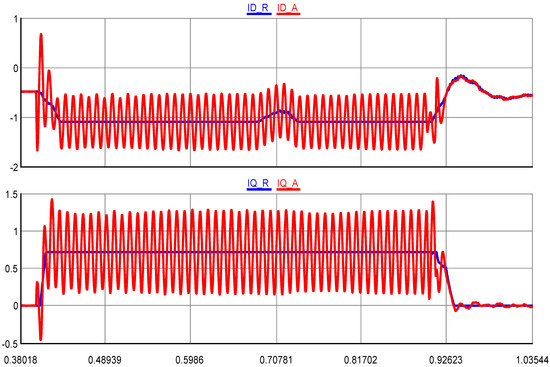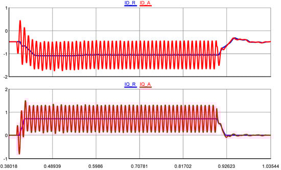 Figure 7 presents the current controller performance of wind generator side converter during the wind speed change. Unlike the fixed capacitor for the reactive power support, the converter provides the required reactive current. The reference currents for the converter have been generated using the Equations (7)–(9). It is seen from Figure 7 that the actual current tracks the reference current with negligible overshoot and zero steady state error during the peak wind energy tracking.