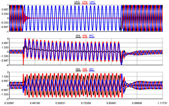 Grid side voltage (PCC1), Y-side and Δ-side current (pu) of the transformer connected MMC1 during 3LG fault in RTDS.