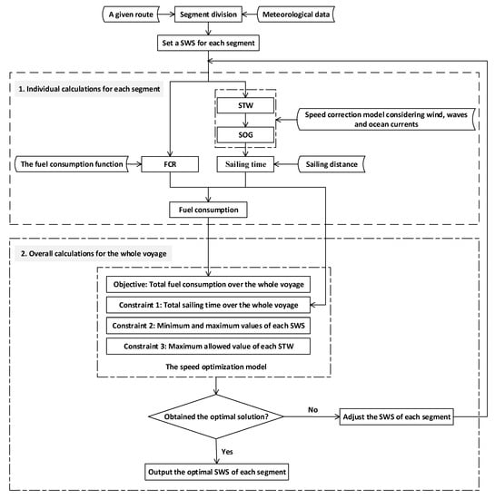 Based on the obtained FCR and sailing time in each segment, main elements of the speed optimization model can be obtained, incl. the fuel consumption in each segment, the total fuel consumption over the whole voyage and the total sailing time over the whole voyage. The purpose of the speed optimization model is to determine the SWS for each segment with the objective of minimizing the total fuel consumption over the whole voyage. In addition to the ETA constraint, there are two further constraints that need to be satisfied. First, the SWS is constrained to change from its minimum to maximum values. Second, for the purpose of safety, the ship has a critical STW (maximum allowed STW) when sailing in wind and waves. Details of the speed optimization model can be seen in Section 3.2.3. The modeling steps of the speed optimization problem are illustrated in Figure 1.