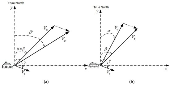 With the assistance of Figure 3b, we can develop formulae for calculating the SOG readily. According to the method of vector decomposition, the components of in the direction and the direction are and , respectively. Similarly, the components of in the direction and the direction are and , respectively. Therefore, the components of in the direction and the direction can be expressed as Equations (14) and (15), respectively: