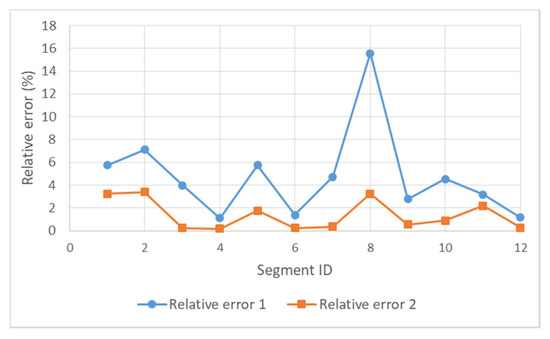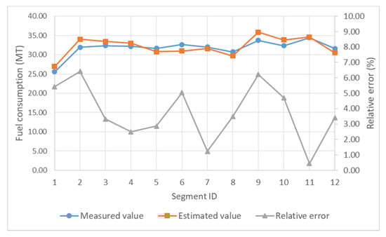 For segment , the measured value of can be calculated based on and the corresponding sailing time in Table 8. Meanwhile, the estimated value of can be obtained based on the value of in Table 8 and the speed correction model in Section 3.2.2. Here, two estimated values of are obtained. The first one is obtained under the condition that the influence of ocean currents is not considered, while the second one is calculated under the condition that the influence of ocean currents is taken into account. In the first case, the estimated value of is actually the estimated value of . For each segment, the measured and the estimated are compared, and the relative error between them is calculated, as shown in Table 10. From this table, we can see that: (a) when the influence of ocean currents is not considered, the average relative error of the speed correction model is 4.75%; and (b) when the influence of ocean currents is taken into account, this value becomes 1.36%. Intuitive verification results of the speed correction model are shown in Figure 6 and Figure 7. Based on these results, we can draw the conclusion that the error between the estimated and the measured can be effectively reduced if the influence of ocean currents is taken into account.