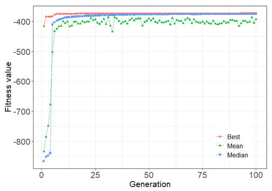 The solution approach in Section 4 is programmed with R programming language. The parameter settings of the GA are presented in Table 11. We ran the program 10 times. The average running time of the program was 14.86 s. The results of the 10 runs of the program were consistent, indicating that the algorithm had a good stability. We randomly selected one of the above 10 running results for further analysis. The convergence curve of this run is presented in Figure 8. Based on this figure, we can draw the conclusion that the designed GA has good convergence and convergence speed on the target problem.