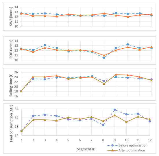 Comparison of still water speed (SWS), SOG, sailing time and fuel consumption of each segment before and after optimization.