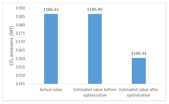 The CO2 emission factor is related to the fuel type. The selected oil products tanker mainly consumes heavy fuel oil (HFO), whose CO2 emission factor is 3.114 MT/MT of fuel, according to the IMO [6]. For the target voyage, the reduction of CO2 emissions due to speed optimization can be calculated readily by multiplying the above CO2 emission factor by the fuel saving of 8.39 MT. Specifically, after optimization, the reduction of CO2 emissions over a 280-h voyage is 26.12 MT. The amount of CO2 emissions over the target voyage is shown in Figure 10.