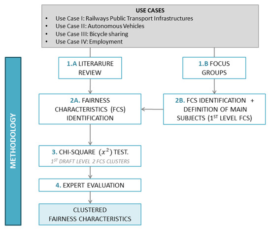 Identifying the needs and barriers women face as users and employees of the transport sector will allow the determination of a series of factors, called fairness characteristics (FCs), which are fair to men and women by including aspects of justice, equity, and equality (of opportunity and of outcome) [32,33,34]. Within this study, fairness was defined as a state in which people are treated similarly, unimpeded by prejudices or unnecessary distinctions or barriers, unless they can be explicitly justified. Therefore, FCs are based on those aspects that all female users find important for a comfortable, safe, and useful service or for inclusive and fair employment in transport.