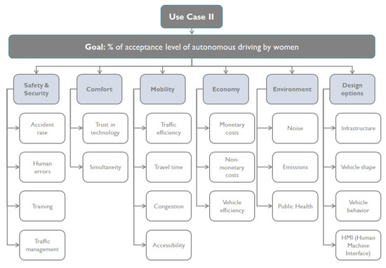 The National Highway Safety Administration (NHTSA) organizes vehicle automation into six levels, ranging from Level 0 vehicles without any automation to Level 5 of fully automated vehicles [64]. The objective of Use Case II is to investigate the acceptance of autonomous vehicles of Level 4 (i.e., the Automated Driving System (ADS) can perform by itself all driving tasks and monitor the driving environment in certain circumstances) and Level 5 (i.e., the ADS can do all the driving in all circumstances) by women as users of the road.
