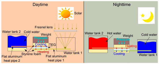 During the daytime, solar radiation (light) passes through the Fresnel lens, which focuses the light on a portion of flat aluminum heat pipe 1, which is covered by a black absorbing paint (ICHINEN TASCO CO., LTD., Osaka, Japan, emissivity of 0.94). The heat transfers from the concentrated solar radiation to cold water (thermal energy transfers to the water tank 2). The TEG can generate electricity due to the temperature differences resulting from the concentrated solar radiation below and contact with the cold water on the top.
