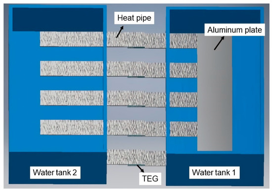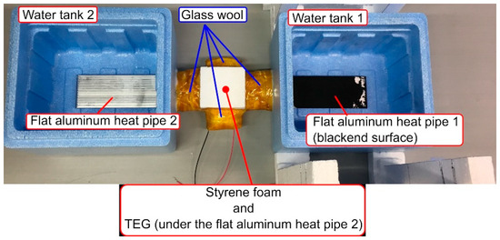 The design of the system is shown in Figure 1. Two flat aluminum heat pipes (flat aluminum heat pipe 1, 2) are used, and each of them has a thermal couple attached to the TEG’s upper and lower sides by thermally conductive tapes (3M Japan Limited, Tokyo, thermal conductivity of 1.5 W/m K). Moreover, these flat aluminum heat pipes are connected with water tank 1, 2 by the waterproof adhesive (CEMEDINE CO., LTD., Tokyo, Japan). The wick structure is used in the heat pipes so the system can easily shift the heat transfer direction. Metal weights (3087.5 g) are placed on top of the TEG and flat aluminum heat pipe 1, 2 in order to reduce the thermal resistance between TEG and flat aluminum heat pipe 1, and between TEG and flat aluminum heat pipe 2.