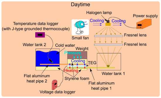 The schematic diagram of the daytime experiment is shown in Figure 3. The purpose of this daytime experiment is to test the light-to-heat conversion efficiency of the system during the day. In the daytime experiment, a halogen lamp was used to supply the light. It was chosen since the light supplied by that lamp has a similar wavelength as solar radiation. The power of the halogen lamp was set to 75 W and 100 W (maximum power of the halogen lamp is 110 W). However, due to the heat loss or the other losses from the halogen lamp, the power supplied to the Fresnel lens becomes smaller. Moreover, the optical efficiency of the Fresnel lens and absorptivity of the black absorbing film must be taken into account in the system so the power concentrated on the flat aluminum heat pipe becomes much lower than the initial power. Specifically, the initial power supplied by the halogen lamp decreased from 75 W (electrical power) to 14.84 W (light intensity), and 100 W to 21.17 W, respectively. The values of light intensity were measured by a solar radiation meter. The temperature of the halogen lamp became very hot during the operation, so a small fan was used to cool the lamp. Two Fresnel lenses were used in the experiment since the halogen lamp only produces scattered light. The first Fresnel lens parallelized the scattered light from the lamp, and the second Fresnel lens was used to focus the parallel light. A temperature data logger with J-type grounded thermocouple was used to measure the temperature of cold water. A voltage data logger was used to measure the open-circuit voltage of TEG generated by the Seebeck effect. Cold water of masses of 1000 g and 2000 g was used in the experiments.