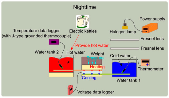 The schematic diagram of the nighttime experiment is shown in Figure 4. The purpose of this nighttime experiment is to check the reverse operation of the heating efficiency of the system at night. For the nighttime experiment, the halogen lamp is turned off, since there is no sunlight during the nighttime. Hot water (80–90 °C) was provided by heating water using an electric kettle since the halogen lamp did not have sufficient power to make hot water in a short period of time for this experiment. A temperature data logger with J-type grounded thermocouple and thermometer were used to measure the temperature of hot water and cold water, respectively. As is the case in the daytime experiment, the voltage data logger was used to measure the open-circuit voltage of TEG. Cold water amounts of 2000 g and 3000 g, and hot water amounts of 1000 g and 2000 g, were used in the experiments.