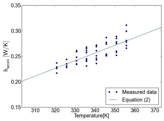 Here, is the rate of heat loss from the water tank per unit temperature difference, is the temperature of water in the tank, is the ambient temperature. The value of with respect to the water temperature are determined by the simple experiment and by using Equation (1). In the simple experiment, the hot water is poured into the water tank (the heat pipes are not connected) and the hot water temperature change (heat loss from the water tank) is measured. is calculated for every 5 °C (e.g., 80–85 °C, 75–80 °C, 70–75 °C) by using the measured values. The value of and the average temperature at each temperature range are substituted into Equation (1) so that the value of is determined. The results are shown in Figure 5.