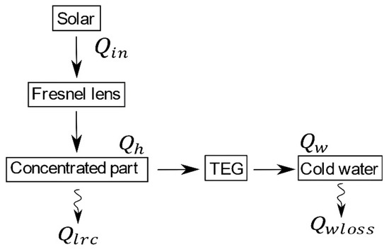 Here, is the solar radiation flux incident of the Fresnel lens, is the area of the lens, is the optical efficiency of the lens, and is the absorptivity of the black absorbing film.