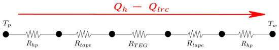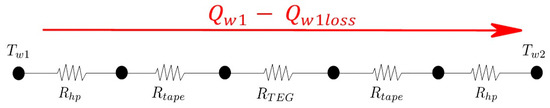 is the thermal resistance of TEG (=2.6 [K/W]), is the number of TEG, is the thermal resistance of the thermally conductive tape (=0.0513 [K/W]), and is the thermal resistance of the heat pipe (=0.2 [K/W]).