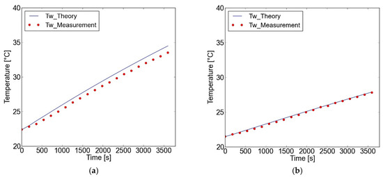 - The heat loss factors (heat loss from the water tank (, , ) and the black absorbing plate ()) are treated as a constant value in the heat balance equation to derive the equation of water temperature change easily. These factors will be calculated separately and substituted into the equation of water temperature change for every unit of time (one minute). In other words, the water temperature will be calculated for every unit of time (one minute). The initial value of the heat loss factors can be determined by using the initial water temperature.