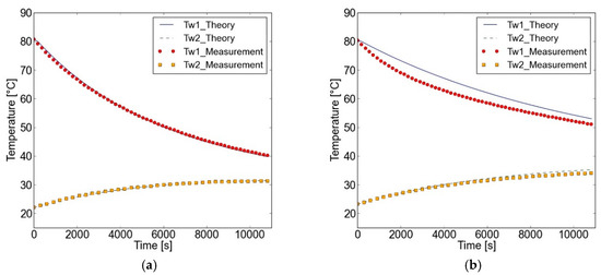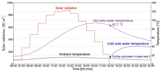 Here, is the initial temperature of hot water in the storage tank, is the initial temperature of cold water in the storage tank. The second initial condition can be derived by using the equation of the thermal resistance circuit (Equation (25)). From these initial conditions, the value of and can be determined as follows,