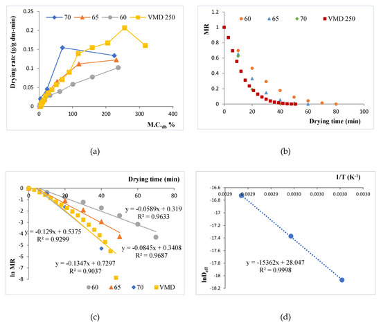 Plots for drying kinetics of vacuum microwave drying (VMD) and oven drying (OD) at 60 °C, 65 °C, and 70 °C. (a) Drying rate curve for brewers’ spent grains (BSG) samples for different OD temperatures (60 °C, 65 °C, and 70 °C) and for VMD; (b) Moisture Ratio (MR) versus drying time for the samples; (c) plotting ln MR versus drying time for the samples at 60 °C, 65 °C, and 70 °C oven drying and VMD treatment; (d) ln Deff versus 1/T.