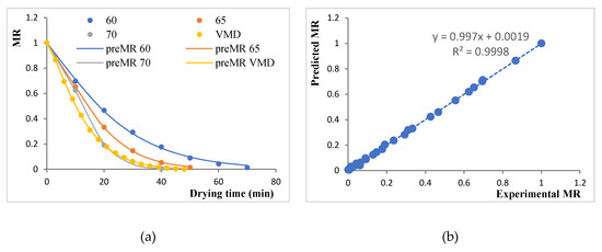 Plots for modeling the moisture ratio (MR): (a) Experimental MR versus drying time fitted with the Page model for various drying treatments; (b) correlation between experimental and predicted MR values as per the Page model.
