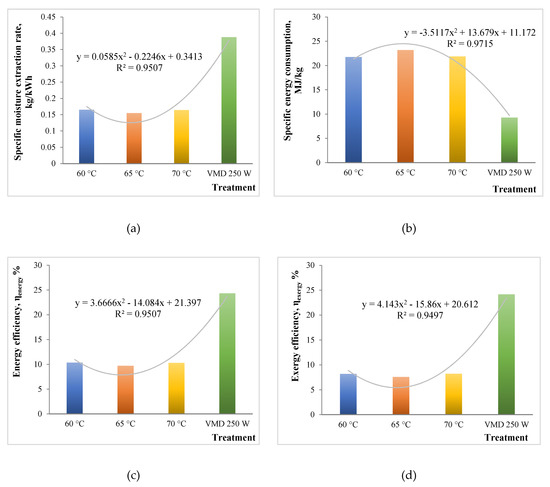 Energy and exergy analyses plots for different drying treatments: (a) Specfic Moisture Extraction Rate; (b) Specific Energy Consumption; (c) Energy efficiency, ηen; (d) Exergy efficiency, ηex.