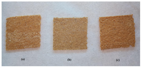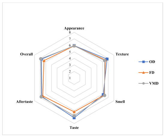 Baked chips were prepared by incorporating the dried BSG flours obtained using OD-65 °C, VMD and FD (Figure 4) The sensory profiles for the baked chips made by using different dried BSGs are given in Figure 5. The diagram shows mean scores of each sensory attribute (namely appearance, texture, taste, smell, aftertaste, and overall acceptability) on a scale of 1 to 9 for all the types of chips on a cobweb plot radiating from the center point. The results showed (also statistical analysis) that there was no significant difference (p > 0.05) between the appearance of baked chips made using dried BSG obtained from any technique. In fact, there was no visual difference between the chip samples of each type. The appearance was “liked slightly” according to the mean score by panelists. What is more, the sensory characters like smell and aftertaste were also not significantly different (p > 0.05) and indistinguishable for all types of chips. However, VMD samples still got slightly higher mean scores for these characteristics than OD and FD chips. Also, these characteristics were “like moderately” for all types. For texture, the mean score for OD chips sample was slightly higher than VMD and FD samples, which did not differ much. The taste characteristics for the FD sample were significantly lower (p < 0.05) than both VMD and OD samples. This suggests that heat treatment during drying in the case of VMD and OD enhances the taste of BSG greatly. The taste of VMD and OD chips was “liked very much” by panelists. This also affected the overall acceptability of the chips. FD chips obtained the lowest mean scores compared to both the VMD and OD chips. Overall, the VMD chips attained the highest mean scores and were liked very much by panelists.