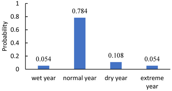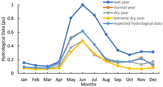where X represents the hydrological condition of the year, W_X is the average monthly or seasonal hydrological data for the year with hydrological condition X as shown in Figure 3, and P(X) is the probability that a year will have hydrological condition X which is shown in Figure 4 for the four different hydrological conditions: wet year, normal year, dry year and extreme dry year.